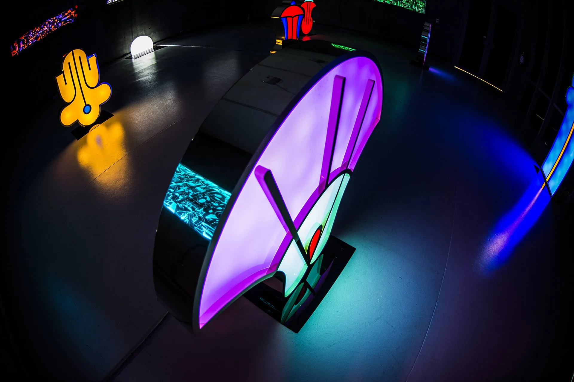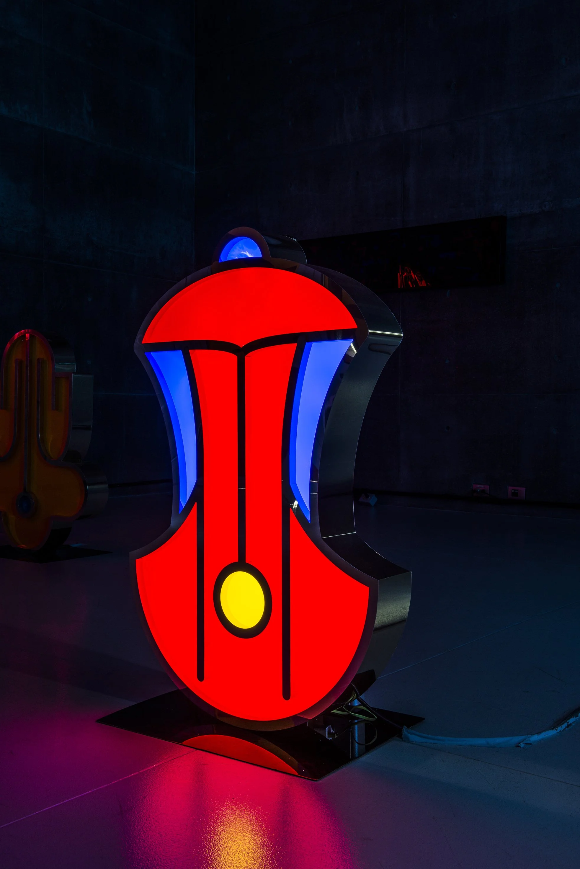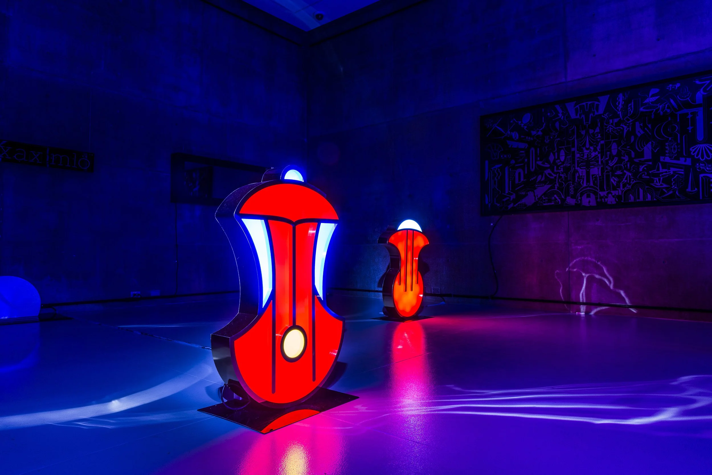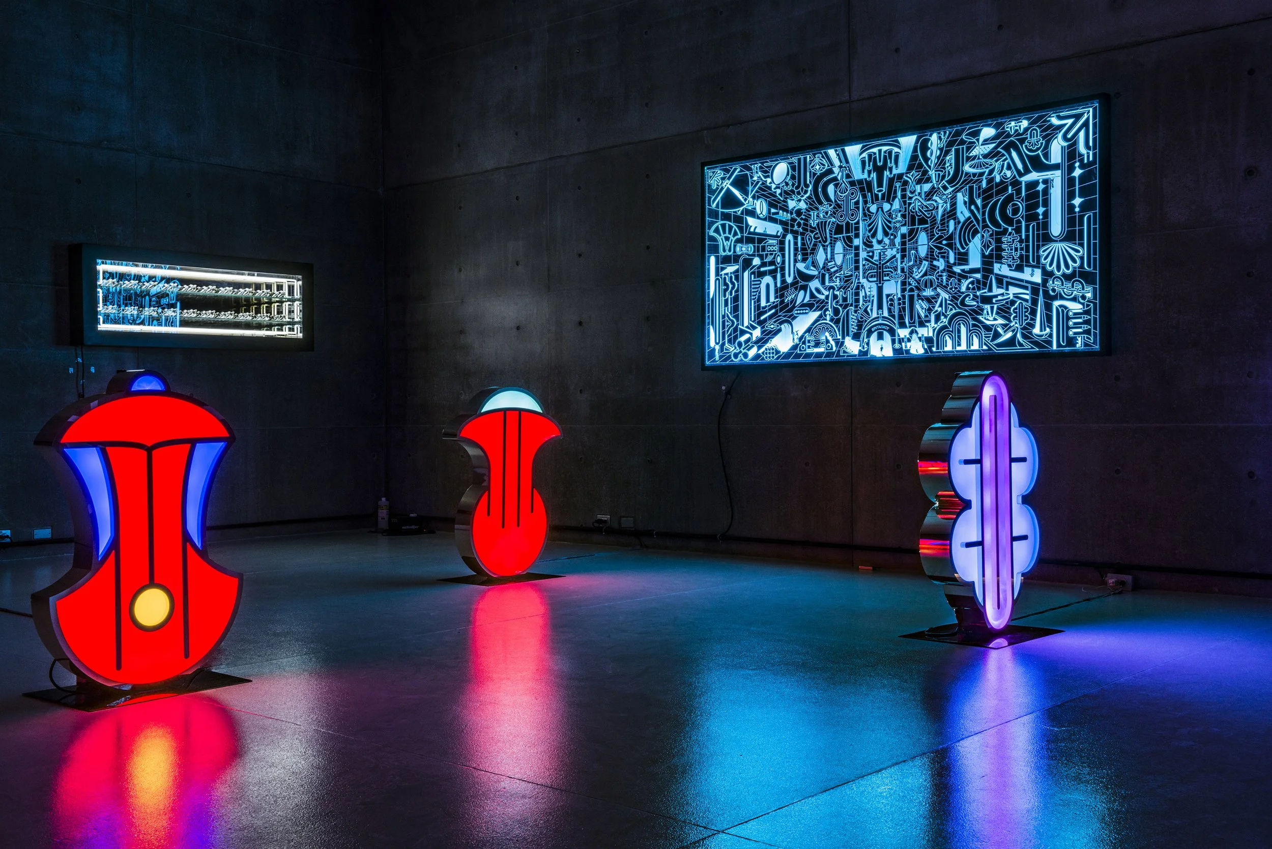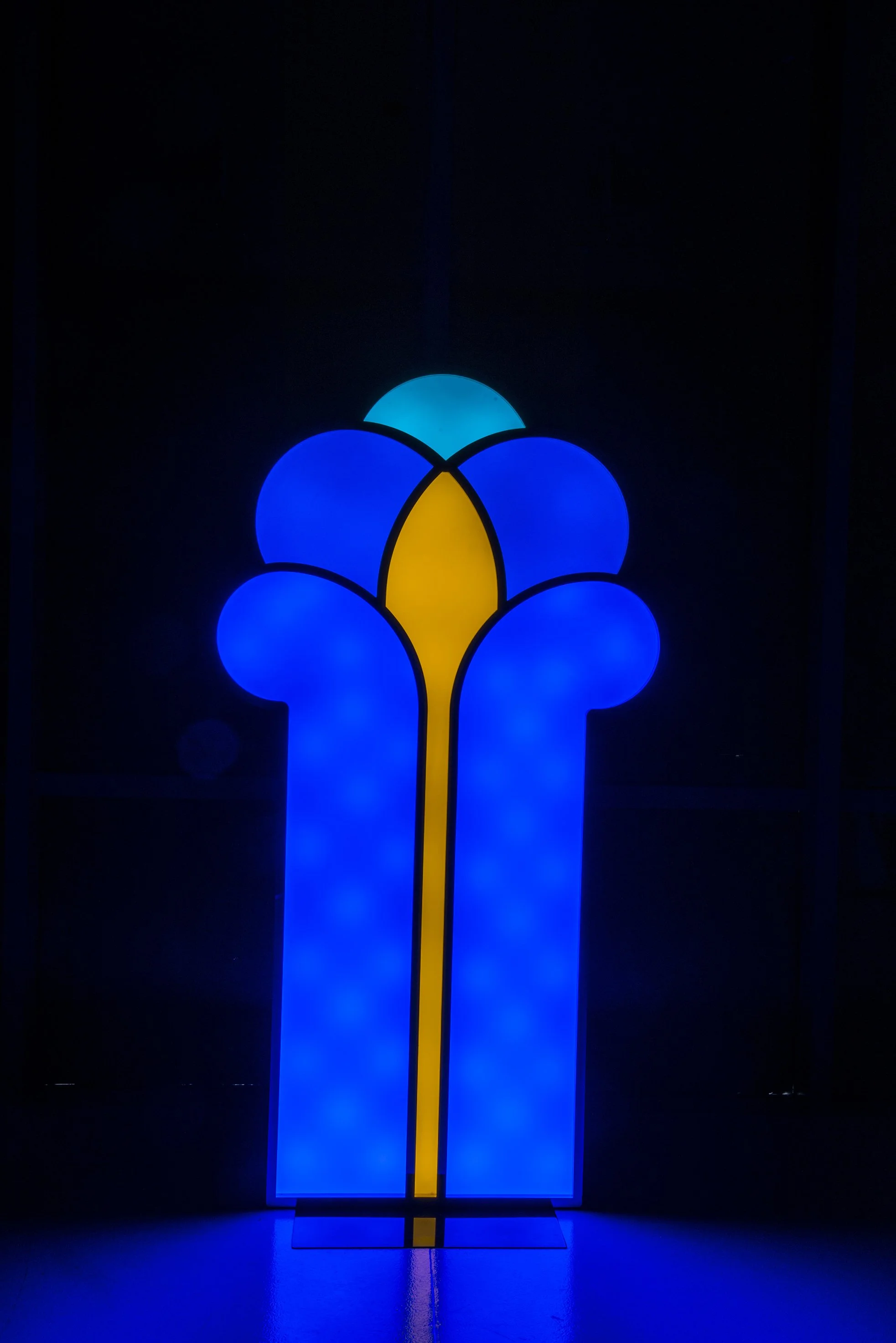 Inspired by the mysterious languages that were spoken in the Boreal and Austral Hemispheres of the respective regions of Tlön, these unknown symbols stand motionless like strange monoliths, with the intention of revealing a coded message that we are unable to understand. The light that emanates from these hieroglyphs, lures us closer to them with the purpose of losing ourselves in their colors and disquieting forms, in a trance that allows the viewer to travel inwards to a reflective self interior space. A place that may hold the key to decode the universal language that this secret alphabet contains.