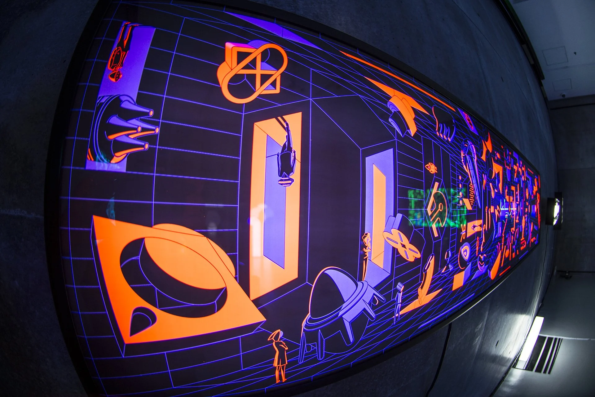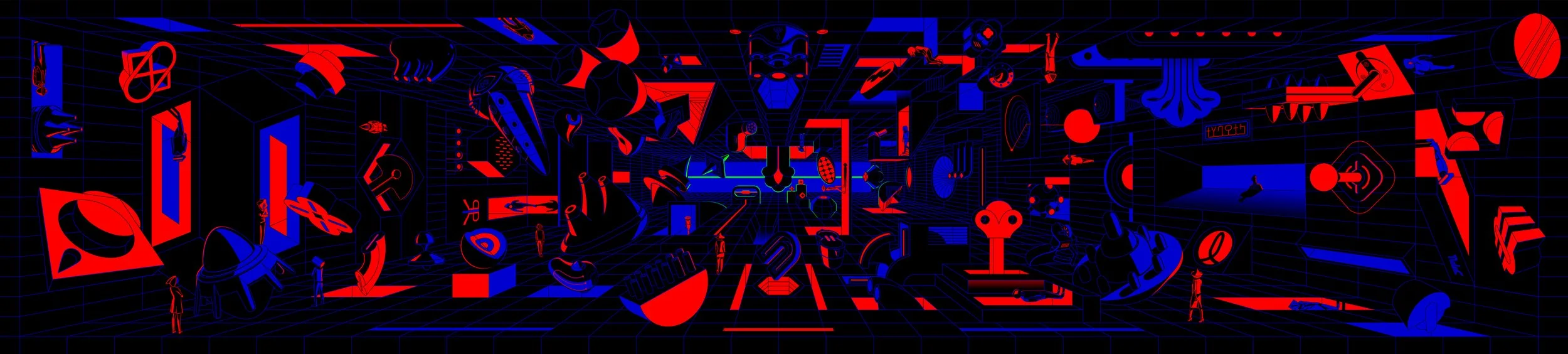 Third illustration of the "FICCIONES" series. Without a doubt, the most peculiar of the images in the collection. This illustration, like the ones that precede it, represents a space that can be perceived from different angles, allowing us to discover a specific narrative of this space from the perspective of the viewer depending on the character they choose to focus on. In this space, no laws, not even that of gravity, seems to obey a known reality, which inevitably leads to the question: where is this place and how can we access it?